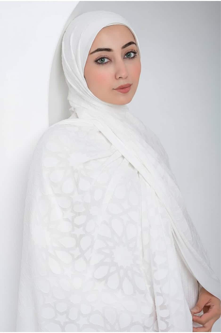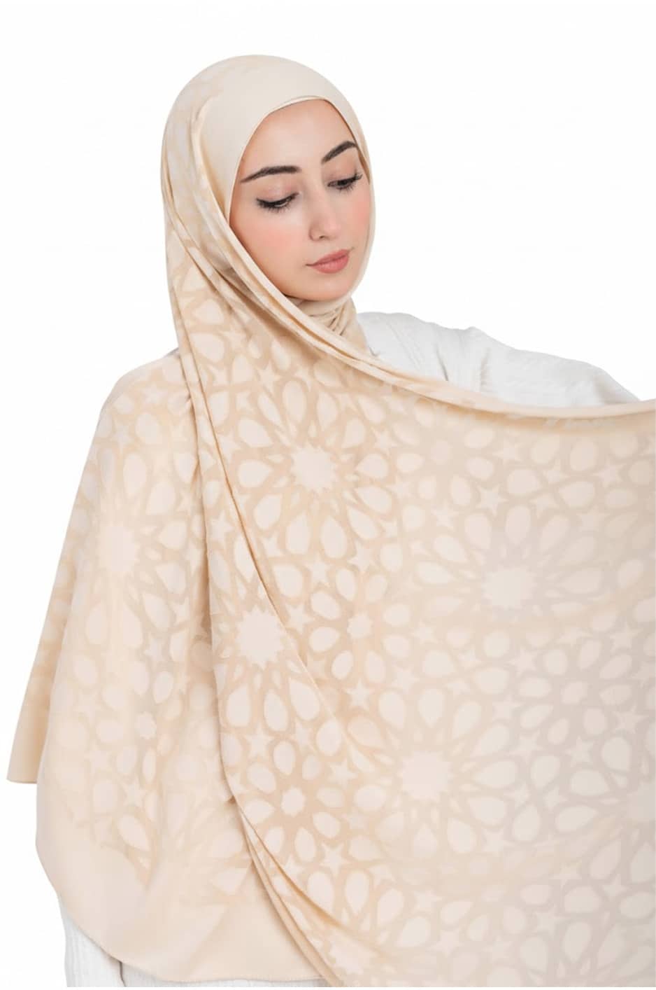 نقشة جاكار هندسية مضلعة تتميز الطرحة بنقوش هندسية مضلعة فنية والمنفذة بأسلوب الجاكار الديفوريه حيث يظهر النسيج شفافا ولامعا في مناطق ومطفيا في مناطق أخرى مما يمنحها قواما مميزا ثلاثي الأبعاد.