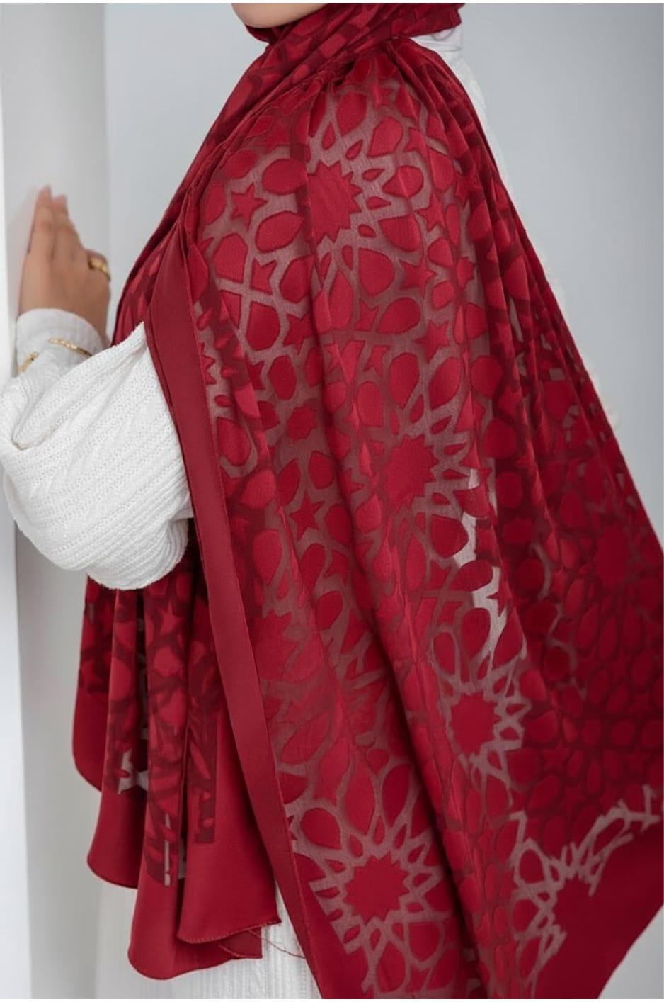 طرحة ديفوريه جاكار تتميز بنسيج شفاف ولامع مع نقشة جاكار هندسية مضلعة بارزة تمنح إطلالتك لمسة أناقة سواريه مثالية للمناسبات والأمسيات المقاس (190*70 سم).
