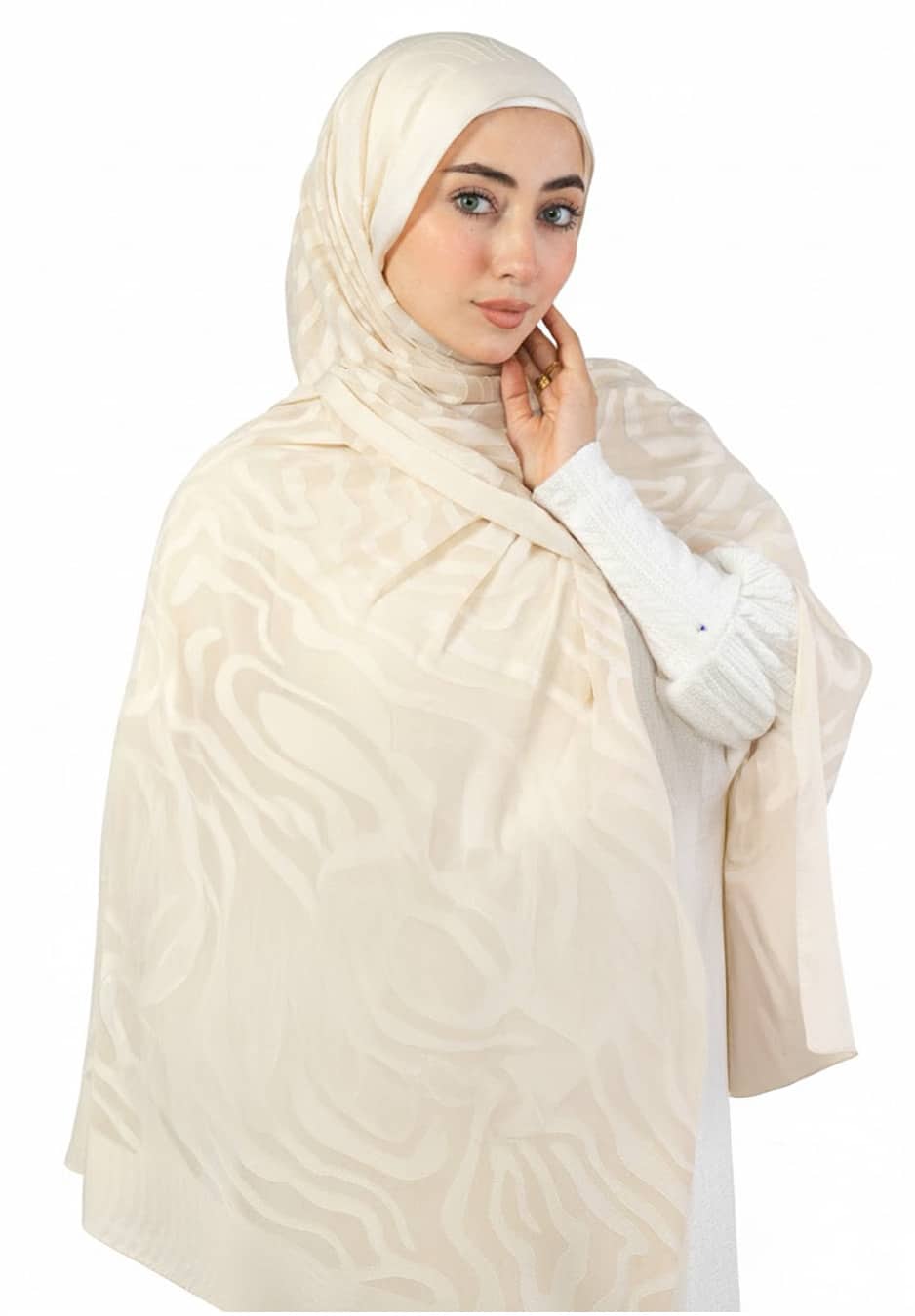 نقشة جاكار تايجر ديفوريه تتميز الطرحة بنقشة التايجر الأنيقة والمنفذة بأسلوب الجاكار الديفوريه حيث يظهر النسيج شفافا ولامعا في مناطق ومطفيا في مناطق أخرى مما يمنحها قواما مميزا ثلاثي الأبعاد.